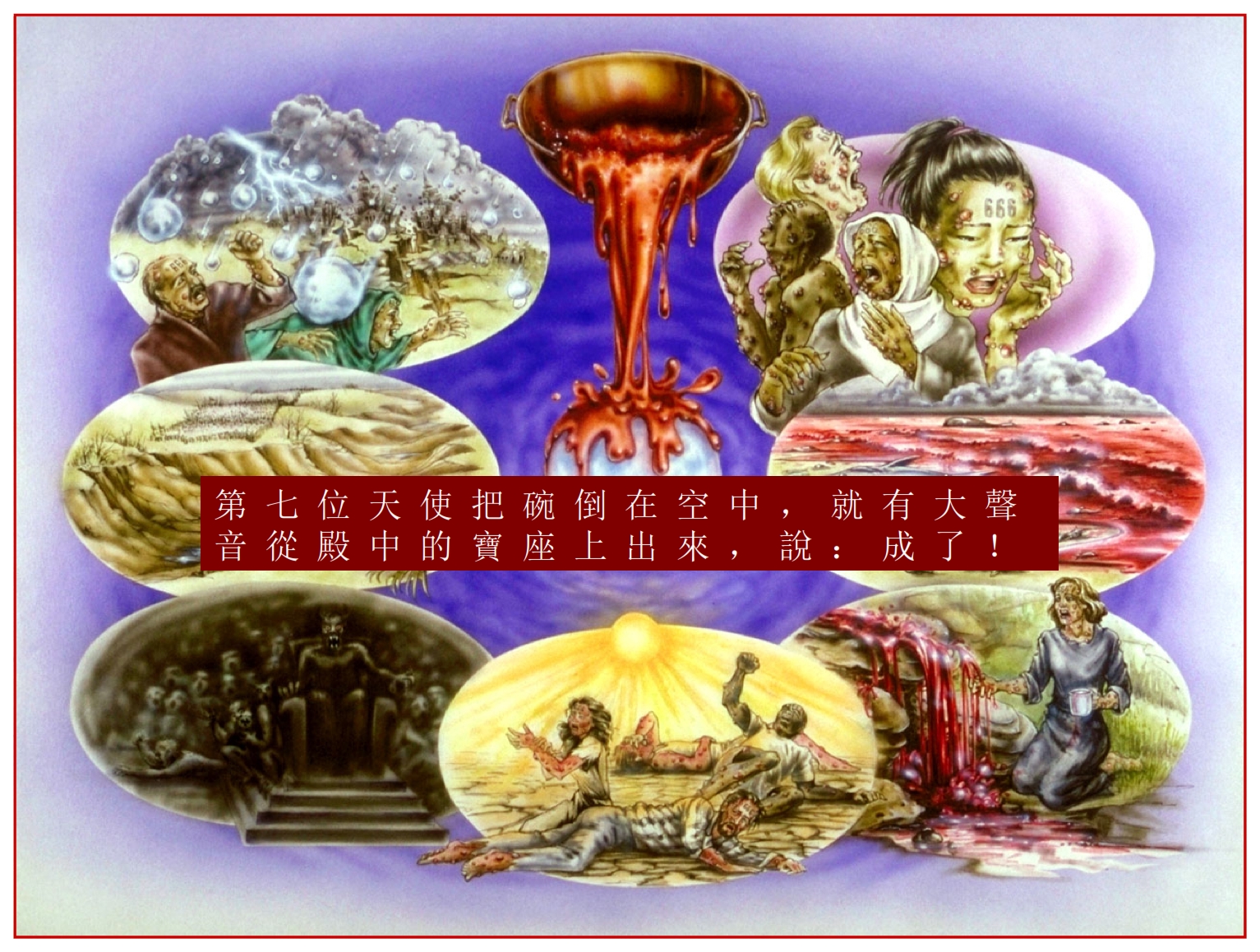 8 第 四 位 天 使 把 碗 倒 在 日 頭 上 , 叫 日 頭 能 用 火 烤 人 。9 人 被 大 熱 所 烤 , 就 褻 瀆 那 有 權 掌 管 這 些 災 的 神 之 名 , 並 不 悔 改 將 榮 耀 歸 給 神 。