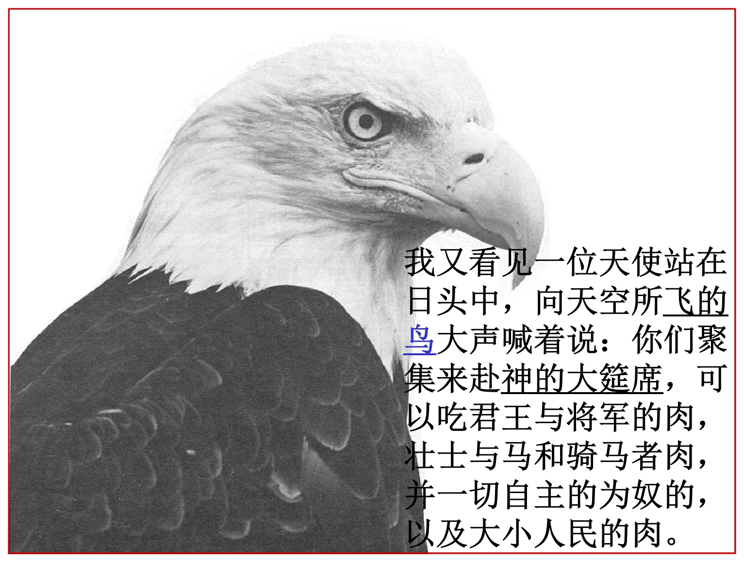17 我 又 看 見 一 位 天 使 站 在 日 頭 中 , 向 天 空 所 飛 的 鳥 大 聲 喊 著 說 : 你 們 聚 集 來 赴 神 的 大 筵 席 ,18 可 以 吃 君 王 與 將 軍 的 肉 , 壯 士 與 馬 和 騎 馬 者 的 肉 , 並 一 切 自 主 的 為 奴 的 , 以 及 大 小 人 民 的 肉 。