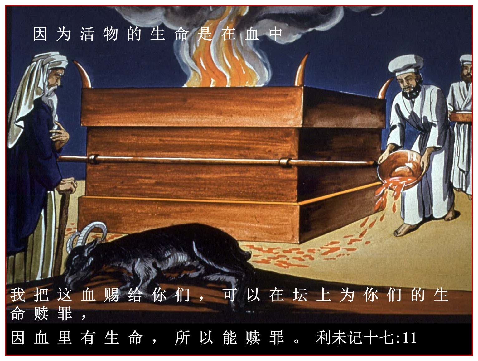 利 未 記 17:11 因 為 活 物 的 生 命 是 在 血 中 。 我 把 這 血 賜 給 你 們 , 可 以 在 壇 上 為 你 們 的 生 命 贖 罪 ; 因 血 裡 有 生 命 , 所 以 能 贖 罪 。
