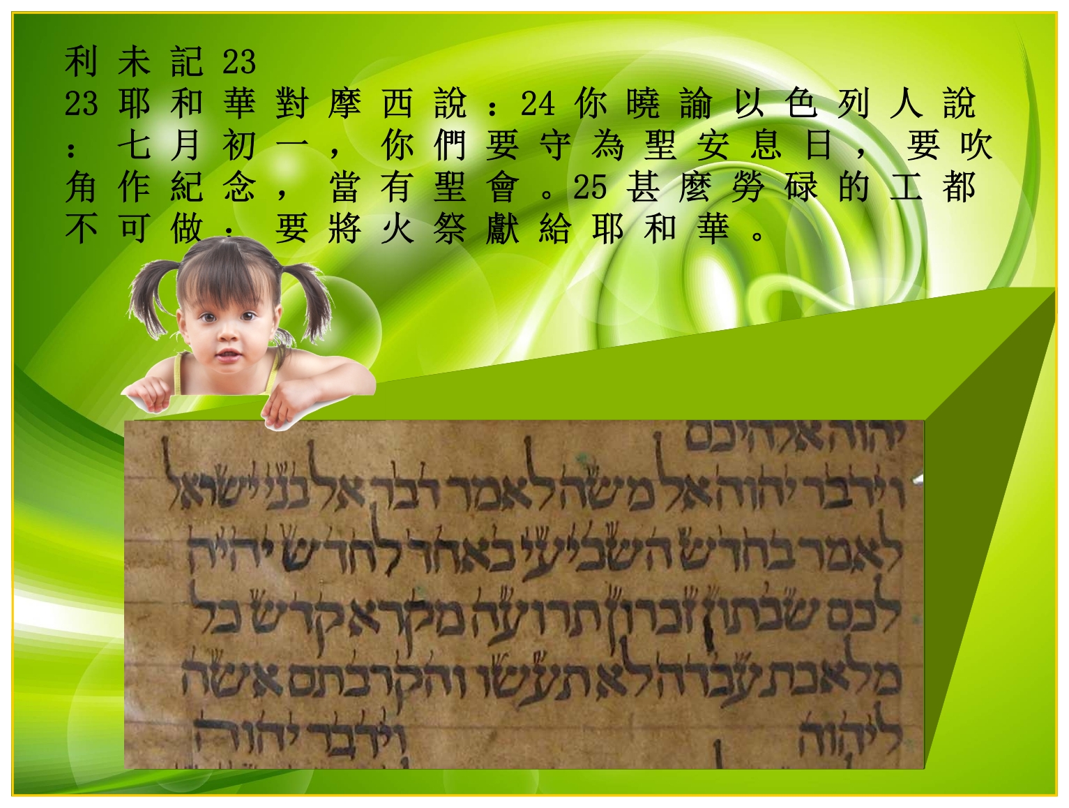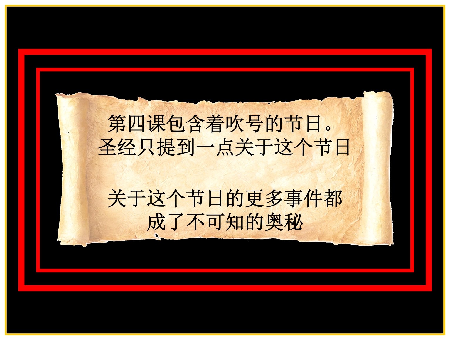 Chinese Language Bible Lesson Feast of Trumpets Chinese Trumpets 版权所有 这个课程中所用到所有版权所有的图片都有得到允许,版权所有的图片都以标明。然而, 所有我私人的原创图片,制图,正文,教案,等。。。 可以无偿使用与非商业盈利活动,包括以下网址的资源。 若有任何建议或疑问,请点击小书卷