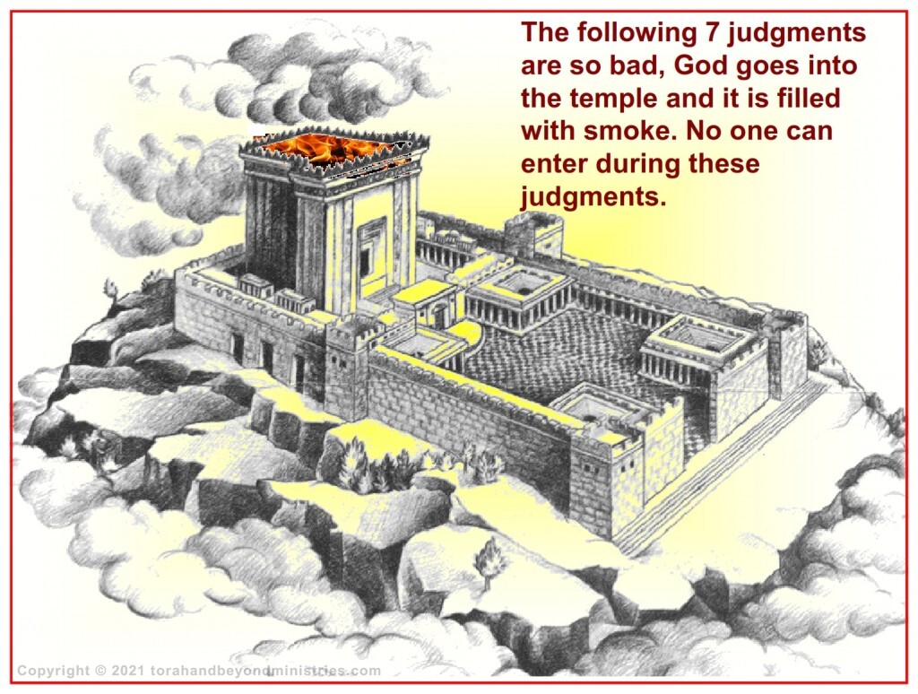 And after that I looked, and, behold, the temple of the tabernacle of the testimony in heaven was opened: And the seven angels came out of the temple, having the seven plagues, clothed in pure and white linen, and having their breasts girded with golden girdles. And one of the four beasts gave unto the seven angels seven golden vials full of the wrath of God, who liveth for ever and ever. And the temple was filled with smoke from the glory of God, and from his power; and no man was able to enter into the temple, till the seven plagues of the seven angels were fulfilled. Revelation 15:5-8