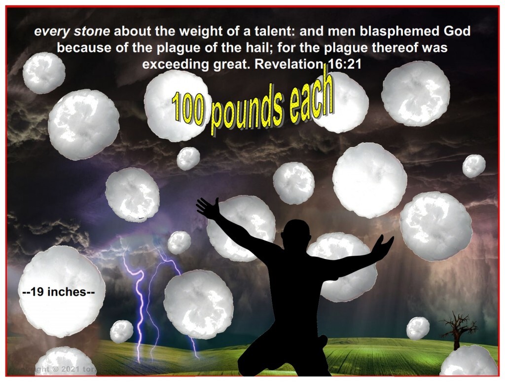 Verse 21 – And there fell upon men a great hail out of heaven, every stone about the weight of a talent: and men blasphemed God because of the plague of the hail; for the plague thereof was exceeding great.