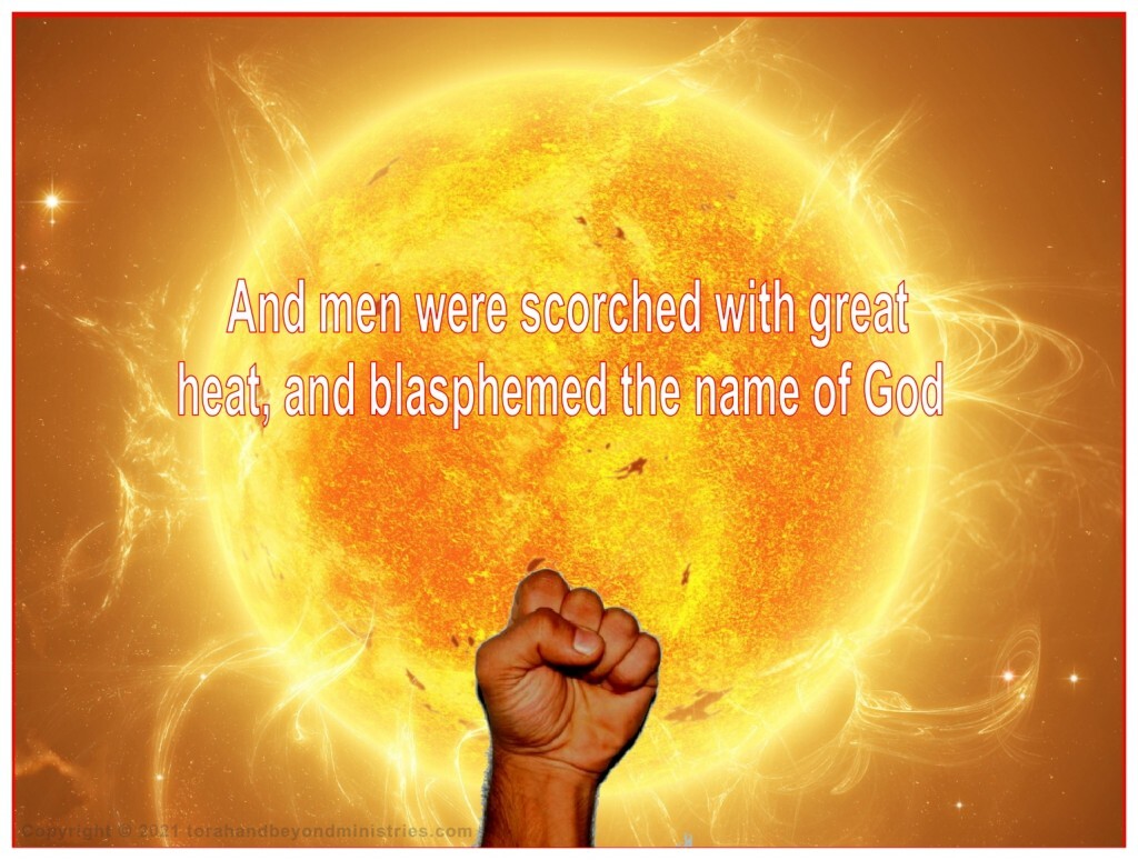 Revelation 16:8 And the fourth angel poured out his vial upon the sun; and power was given unto him to scorch men with fire. And men were scorched with great heat, and blasphemed the name of God, which hath power over these plagues: and they repented not to give him glory.