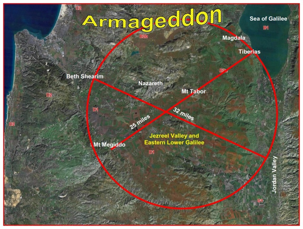 Armageddon, The battle of Har (Hebrew for mountain) Megiddo ( a small mountain on the South West side of the Valley of Jezreel).