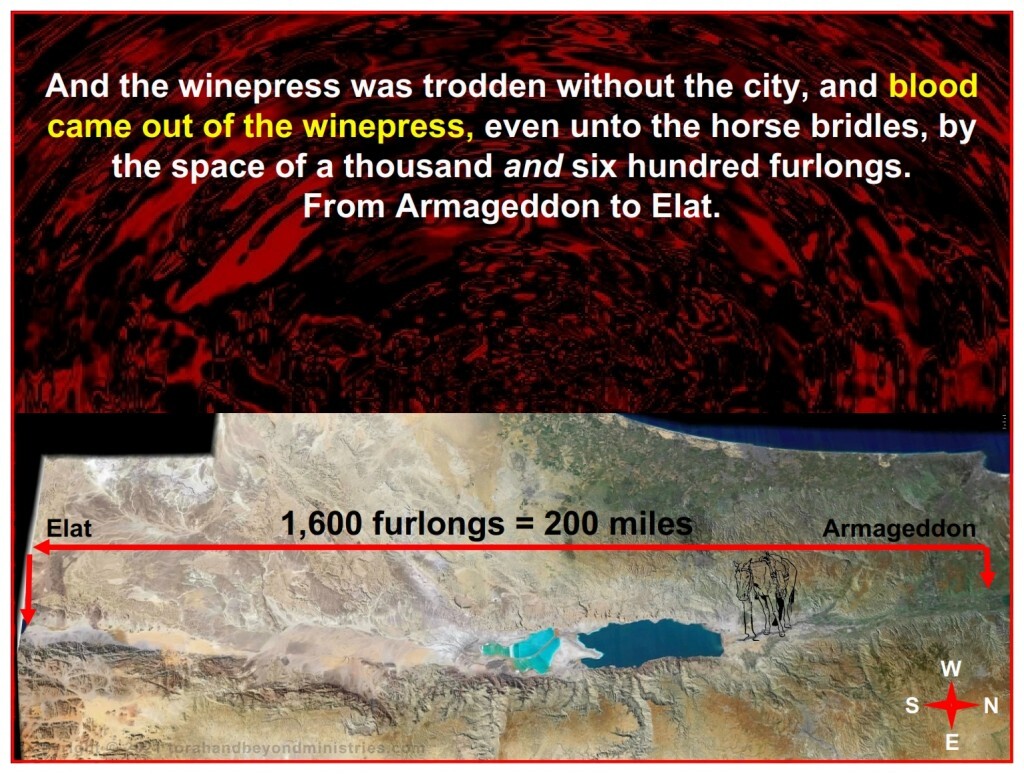 The description in Revelation 14:14-20 is probably the vision of this battle. 14-20 And I looked, and behold a white cloud, and upon the cloud one sat like unto the Son of man, having on his head a golden crown, and in his hand a sharp sickle. And another angel came out of the temple, crying with a loud voice to him that sat on the cloud, Thrust in thy sickle, and reap: for the time is come for thee to reap; for the harvest of the earth is ripe. And he that sat on the cloud thrust in his sickle on the earth; and the earth was reaped. And another angel came out of the temple which is in heaven, he also having a sharp sickle. And another angel came out from the altar, which had power over fire; and cried with a loud cry to him that had the sharp sickle, saying, Thrust in thy sharp sickle, and gather the clusters of the vine of the earth; for her grapes are fully ripe. And the angel thrust in his sickle into the earth, and gathered the vine of the earth, and cast it into the great winepress of the wrath of God. And the winepress was trodden without the city, and blood came out of the winepress, even unto the horse bridles, by the space of a thousand and six hundred furlongs.