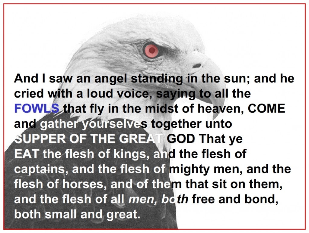 Revelation 19:17-18 And I saw an angel standing in the sun; and he cried with a loud voice, saying to all the fowls that fly in the midst of heaven, Come and gather yourselves together unto the supper of the great God; That ye may eat the flesh of kings, and the flesh of captains, and the flesh of mighty men, and the flesh of horses, and of them that sit on them, and the flesh of all men, both free and bond, both small and great.