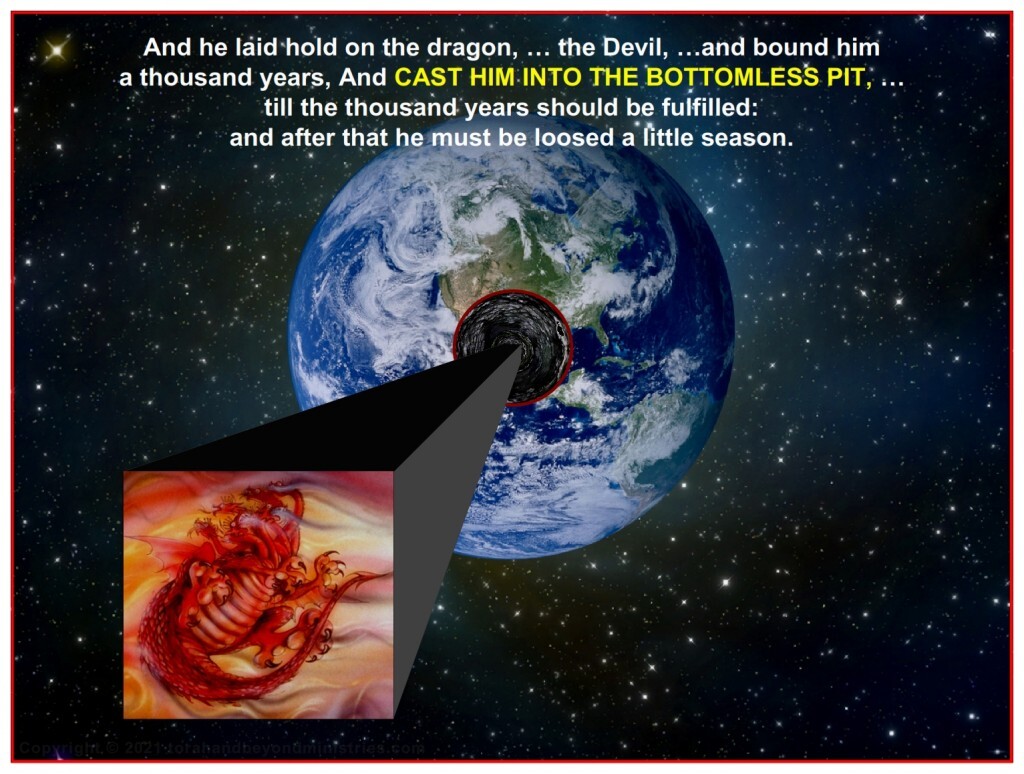 End of the Tribulation: the dragon, that old serpent, which is the Devil, and Satan, and bound him a thousand years, And cast him into the bottomless pit, – copyright and credit line: Art used from Pat Marvenko Smith, copyright 1992.