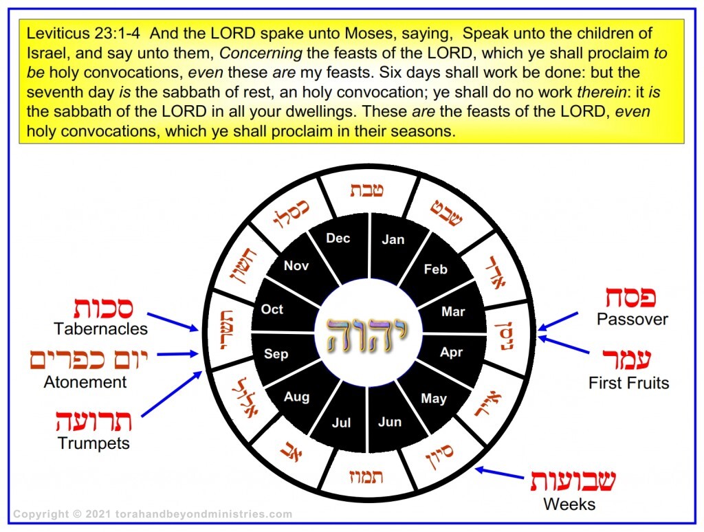 Chronological chart of the times of the Feasts of Leviticus 23. The chart is in Hebrew and English.