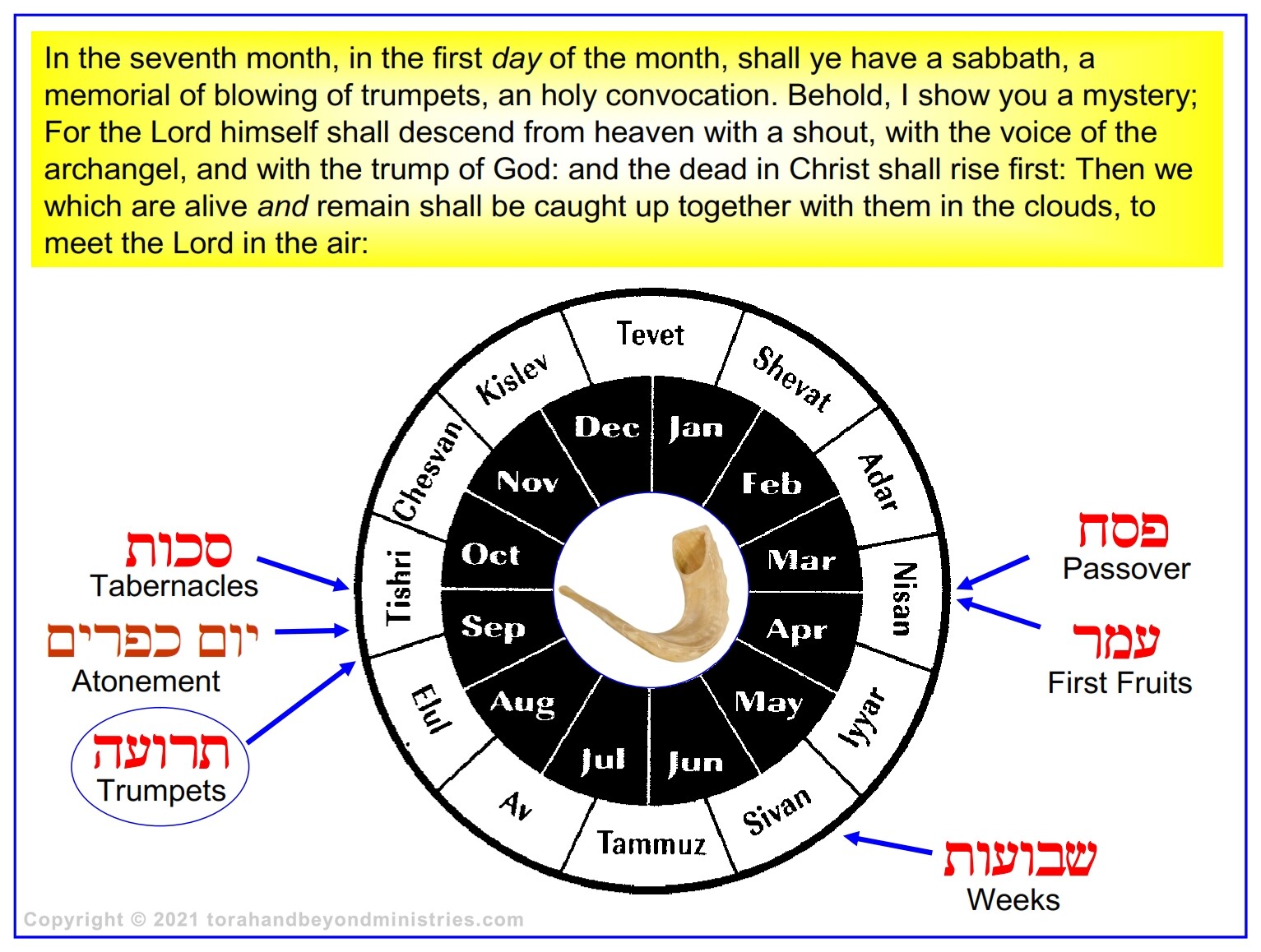 Very few words in Leviticus 23 give any details about this feast. However there are two passages of Scripture in the New Testament that give a clear understanding of what will take place when God is ready for the feast of the 7th month the first day. The chronological order of the feasts make it clear something very important is going to happen between the Feast of Weeks, Pentecost, and the “Time of Jacob’s Trouble” the Tribulation.