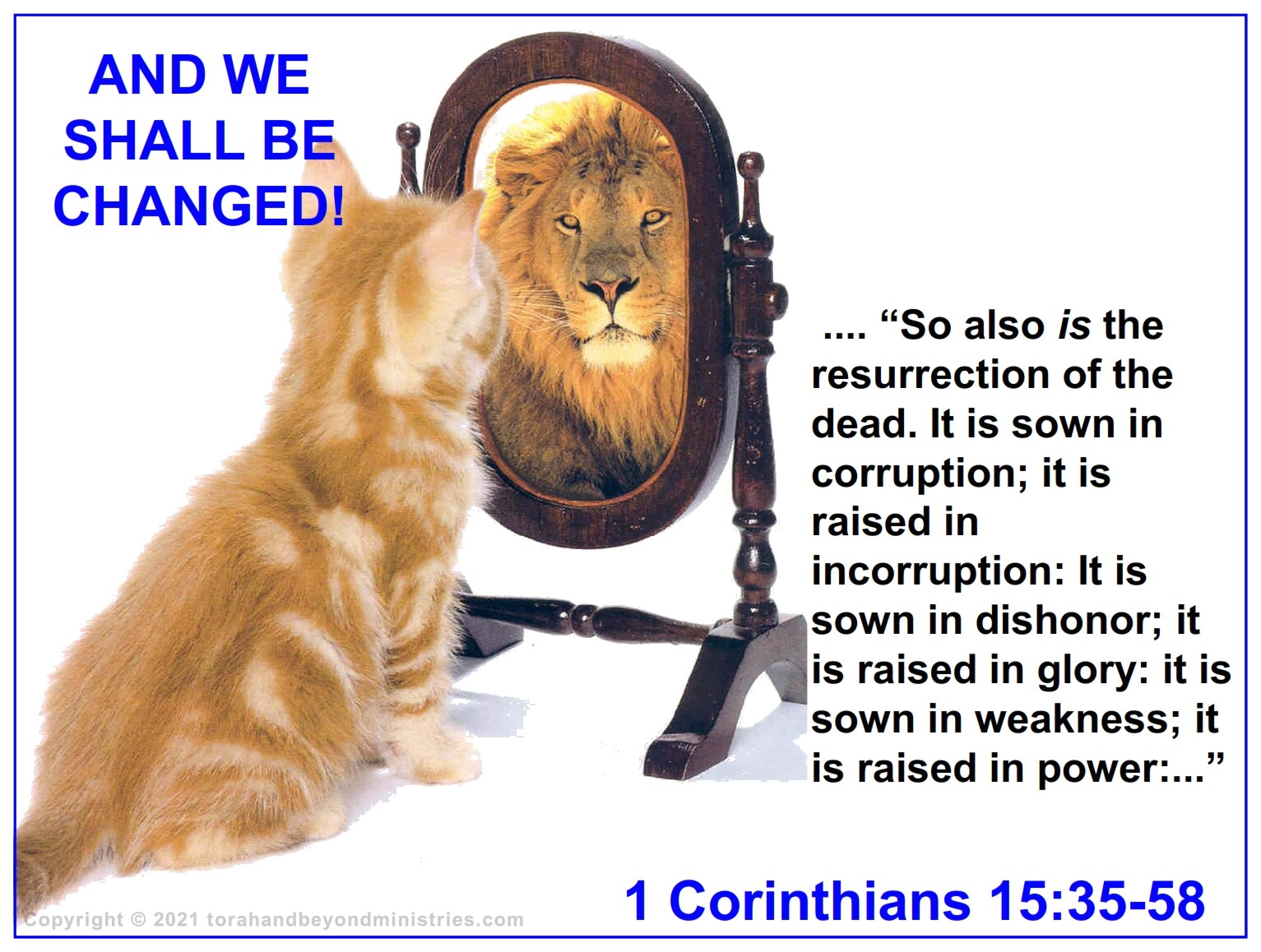 But some man will say, How are the dead raised up? and with what body do they come? Thou fool, that which thou sowest is not quickened, except it die: And that which thou sowest, thou sowest not that body that shall be, but bare grain, it may chance of wheat, or of some other grain: But God giveth it a body as it hath pleased him, and to every seed his own body. All flesh is not the same flesh: but there is one kind of flesh of men, another flesh of beasts, another of fishes, and another of birds. There are also celestial bodies, and bodies terrestrial: but the glory of the celestial is one, and the glory of the terrestrial is another. There is one glory of the sun, and another glory of the moon, and another glory of the stars: for one star differeth from another star in glory. So also is the resurrection of the dead. It is sown in corruption; it is raised in incorruption: It is sown in dishonour; it is raised in glory: it is sown in weakness; it is raised in power: It is sown a natural body; it is raised a spiritual body. There is a natural body, and there is a spiritual body. And so it is written, The first man Adam was made a living soul; the last Adam was made a quickening spirit. Howbeit that was not first which is spiritual, but that which is natural; and afterward that which is spiritual. The first man is of the earth, earthy: the second man is the Lord from heaven. As is the earthy, such are they also that are earthy: and as is the heavenly, such are they also that are heavenly. And as we have borne the image of the earthy, we shall also bear the image of the heavenly. Now this I say, brethren, that flesh and blood cannot inherit the kingdom of God; neither doth corruption inherit incorruption. Behold, I shew you a mystery; We shall not all sleep, but we shall all be changed, In a moment, in the twinkling of an eye, at the last trump: for the trumpet shall sound, and the dead shall be raised incorruptible, and we shall be changed. For this corruptible must put on incorruption, and this mortal must put on immortality. So when this corruptible shall have put on incorruption, and this mortal shall have put on immortality, then shall be brought to pass the saying that is written, Death is swallowed up in victory. O death, where is thy sting? O grave, where is thy victory? The sting of death is sin; and the strength of sin is the law. But thanks be to God, which giveth us the victory through our Lord Jesus Christ. 1 Corinthians 15:34-58