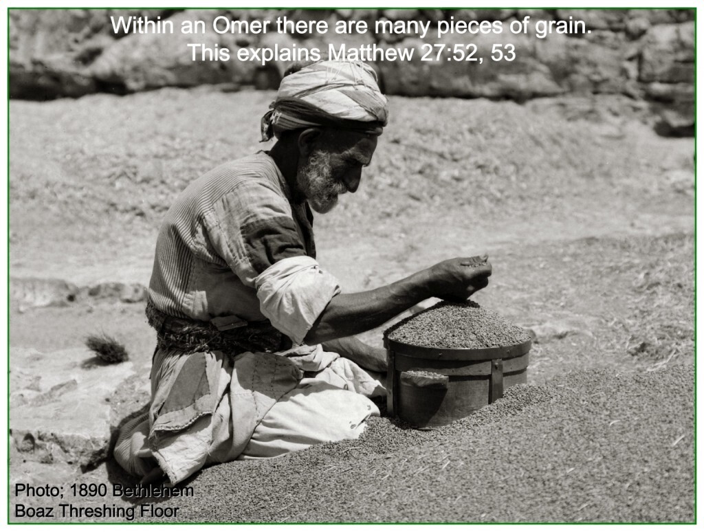 The omer rme is only this small representation of the entire harvest, that is to be brought to the Lord. As Jesus The Messiah left Paradise, He separated an omer’s worth of old Testament Saints for the fulfillment of this feast. Only these Saints from the entire number received their glorified bodies and they went into Jerusalem with the Lord before He went to the Father to present them.
