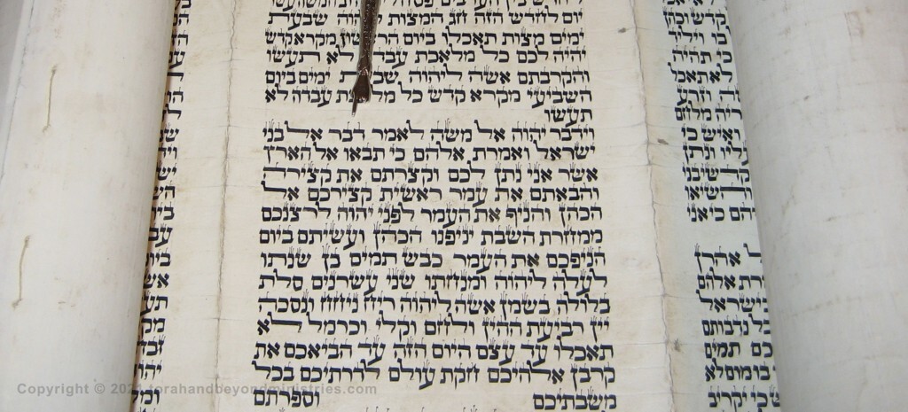 The following photograph was taken from a Torah Scroll written in Morocco on goat skin. The yad (pointer) is indicating the verse Leviticus 23:10