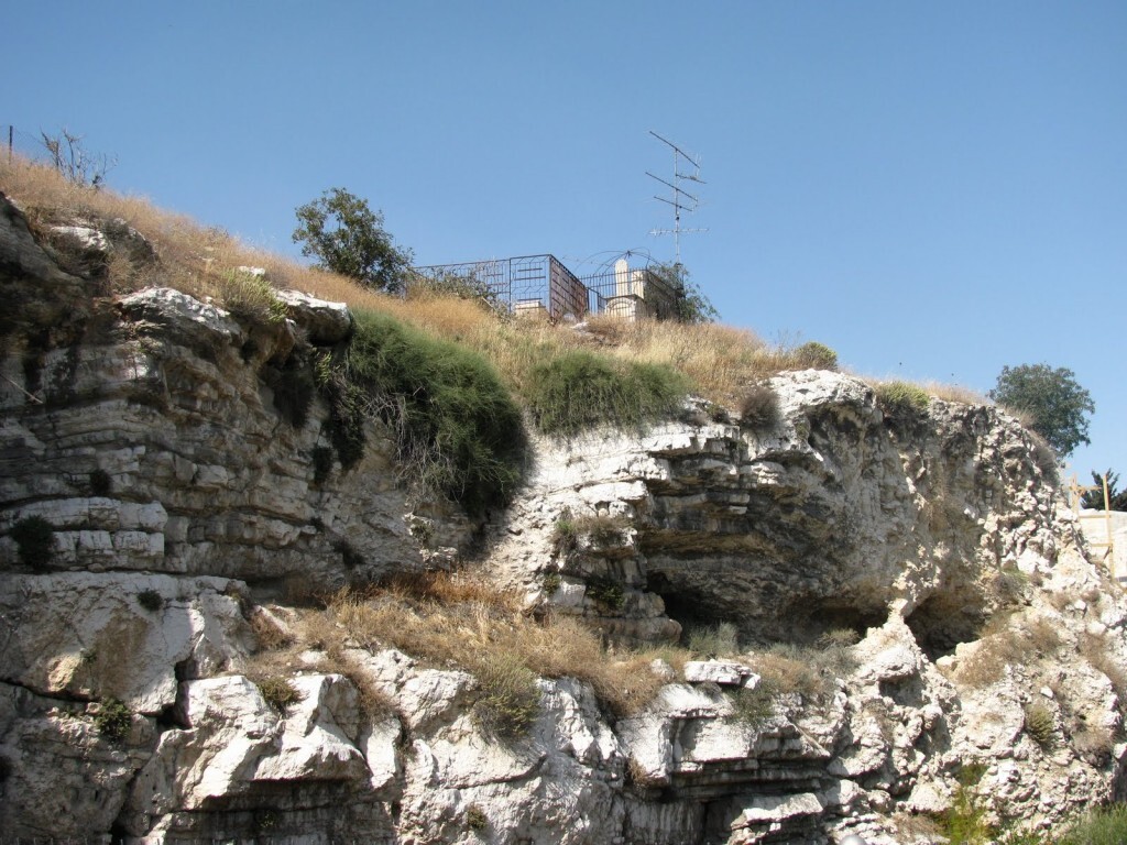 (Note: This hill just outside the old city walls of Jerusalem is where the Roman soldiers conducted many crucifixions. It overlooked the city and was situated by a well traveled road. The indentations on the face of the cliff are not natural as it would not keep this form through time and the seasonal changes. No doubt though, someone is always chipping out the face of the cliff to look like a skull.)