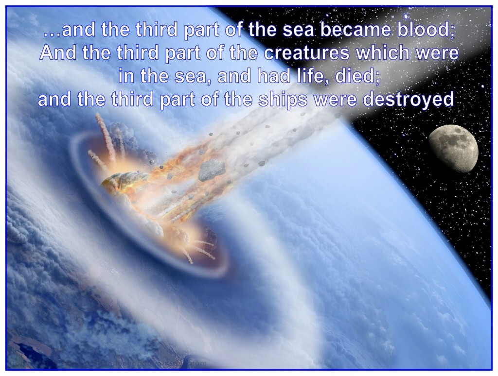 Revelation 8:8-9 And the second angel sounded, and as it werea great mountain burning with fire was cast into the sea: and the third part of the sea became blood; And the third part of the creatures which were in the sea, and had life, died; and the third part of the ships were destroyed.