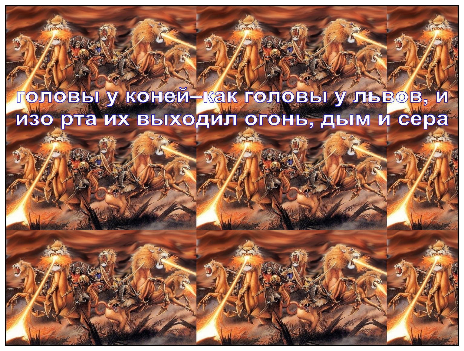 Шестой Ангел вострубил, и я услышал один голос от четырех рогов золотого жертвенника, стоящего пред Богом, говоривший шестому Ангелу, имевшему трубу: освободи четырех Ангелов, связанных при великой реке Евфрате. И освобождены были четыре Ангела, приготовленные на час и день, и месяц и год, для того, чтобы умертвить третью часть людей. Число конного войска было две тьмы тем; и я слышал число его. Так видел я в видении коней и на них всадников, которые имели на себе брони огненные, гиацинтовые и серные; головы у коней–как головы у львов, и изо рта их выходил огонь, дым и сера. От этих трех язв, от огня, дыма и серы, выходящих изо рта их, умерла третья часть людей; ибо сила коней заключалась во рту их и в хвостах их; а хвосты их были подобны змеям, и имели головы, и ими они вредили. Откровение 9:13-19