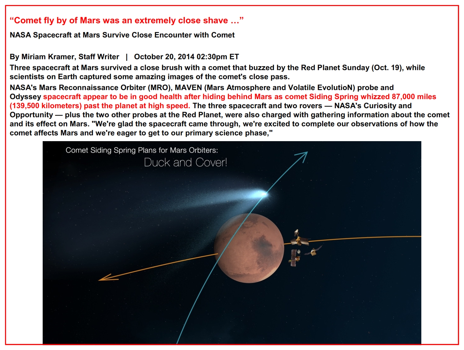 Unexpected Comet tail brushes Mars – October 20, 2014 02:30pm ET “Comet fly by of Mars was an extremely close shave …”