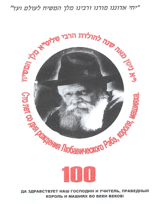 Надпись выше на Иврите и на русском гласит: “Да здравствует наш Господь и Учитель, истинный Король и Машиях (Мессия) во веки веков!”
