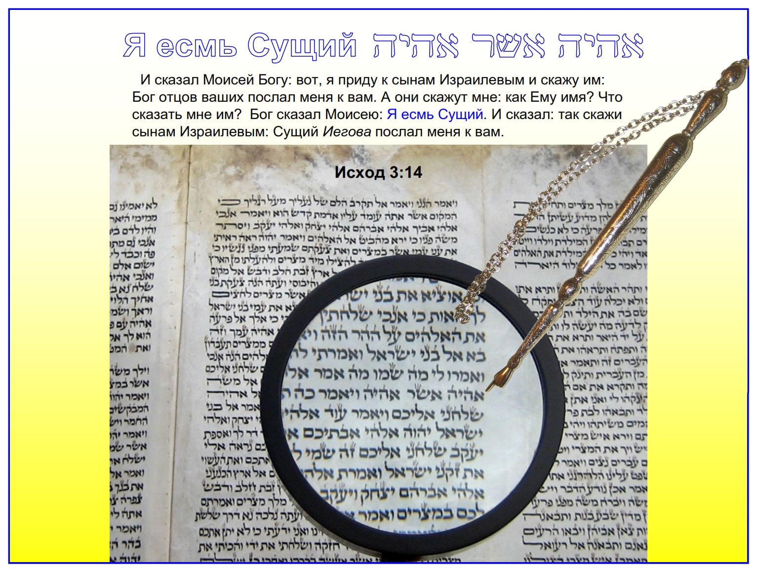 Исход 3:13-15 И сказал Моисей Богу: вот, я приду к сынам Израилевым и скажу им: Бог отцов ваших послал меня к вам. А они скажут мне: как Ему имя? Что сказать мне им? Бог сказал Моисею: Я есмь Сущий. И сказал: так скажи сынам Израилевым: Сущий Иегова послал меня к вам. И сказал еще Бог Моисею: так скажи сынам Израилевым: Господь, Бог отцов ваших, Бог Авраама, Бог Исаака и Бог Иакова послал меня к вам. Вот имя Мое на веки, и памятование о Мне из рода в род.