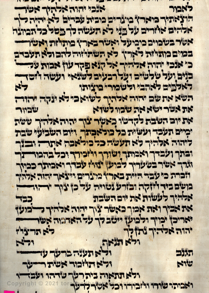 The following photograph is a sheet from a Sephardic Torah Scroll which is perhaps 200 years old. It was written on deer skin with a reed using iron gall ink. The scroll suffered fire damage in the past and is reported to have been in a pogrom against the Jewish community.