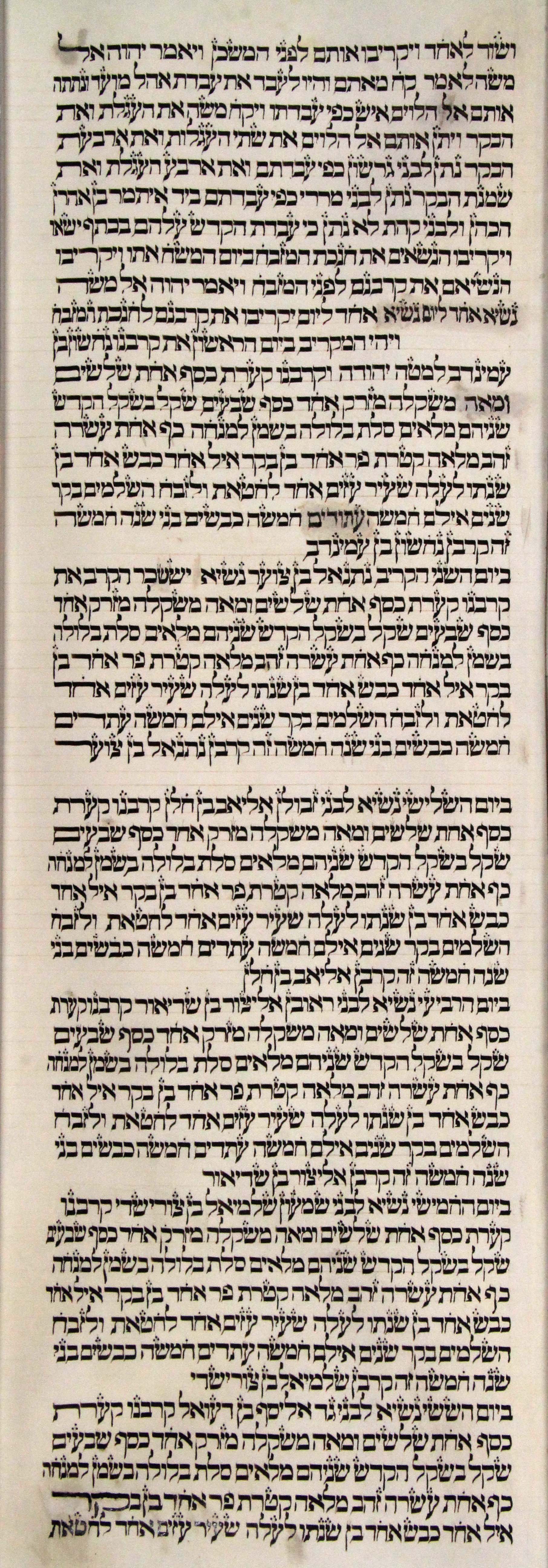 10And the princes offered for dedicating of the altar in the day that it was anointed, even the princes offered their offering before the altar. 11And the LORD said unto Moses, They shall offer their offering, each prince on his day, for the dedicating of the altar. 12And he that offered his offering the first day was Nahshon the son of Amminadab, of the tribe of Judah: 13And his offering was one silver charger, the weight thereof was an hundred and thirty shekels, one silver bowl of seventy shekels, after the shekel of the sanctuary; both of them were full of fine flour mingled with oil for a meat offering: 14One spoon of ten shekels of gold, full of incense: 15One young bullock, one ram, one lamb of the first year, for a burnt offering: 16One kid of the goats for a sin offering: 17And for a sacrifice of peace offerings, two oxen, five rams, five he goats, five lambs of the first year: this was the offering of Nahshon the son of Amminadab. 18On the second day Nethaneel the son of Zuar, prince of Issachar, did offer: 19He offered for his offering one silver charger, the weight whereof was an hundred and thirty shekels, one silver bowl of seventy shekels, after the shekel of the sanctuary; both of them full of fine flour mingled with oil for a meat offering: 20One spoon of gold of ten shekels, full of incense: 21One young bullock, one ram, one lamb of the first year, for a burnt offering: 22One kid of the goats for a sin offering: 23And for a sacrifice of peace offerings, two oxen, five rams, five he goats, five lambs of the first year: this was the offering of Nethaneel the son of Zuar. 24On the third day Eliab the son of Helon, prince of the children of Zebulun, did offer: 25His offering was one silver charger, the weight whereof was an hundred and thirty shekels, one silver bowl of seventy shekels, after the shekel of the sanctuary; both of them full of fine flour mingled with oil for a meat offering: 26One golden spoon of ten shekels, full of incense: 27One young bullock, one ram, one lamb of the first year, for a burnt offering: 28One kid of the goats for a sin offering: 29And for a sacrifice of peace offerings, two oxen, five rams, five he goats, five lambs of the first year: this was the offering of Eliab the son of Helon. 30On the fourth day Elizur the son of Shedeur, prince of the children of Reuben, did offer: 31His offering was one silver charger of the weight of an hundred and thirty shekels, one silver bowl of seventy shekels, after the shekel of the sanctuary; both of them full of fine flour mingled with oil for a meat offering: 32One golden spoon of ten shekels, full of incense: 33One young bullock, one ram, one lamb of the first year, for a burnt offering: 34One kid of the goats for a sin offering: 35And for a sacrifice of peace offerings, two oxen, five rams, five he goats, five lambs of the first year: this was the offering of Elizur the son of Shedeur. 36On the fifth day Shelumiel the son of Zurishaddai, prince of the children of Simeon, did offer: 37His offering was one silver charger, the weight whereof was an hundred and thirty shekels, one silver bowl of seventy shekels, after the shekel of the sanctuary; both of them full of fine flour mingled with oil for a meat offering: 38One golden spoon of ten shekels, full of incense: 39One young bullock, one ram, one lamb of the first year, for a burnt offering: 40One kid of the goats for a sin offering: 41And for a sacrifice of peace offerings, two oxen, five rams, five he goats, five lambs of the first year: this was the offering of Shelumiel the son of Zurishaddai. 42On the sixth day Eliasaph the son of Deuel, prince of the children of Gad, offered: 43His offering was one silver charger of the weight of an hundred and thirty shekels, a silver bowl of seventy shekels, after the shekel of the sanctuary; both of them full of fine flour mingled with oil for a meat offering: 44One golden spoon of ten shekels, full of incense: 45One young bullock, one ram, one lamb of the first year, for a burnt offering: 46One kid of the goats for a sin offering: