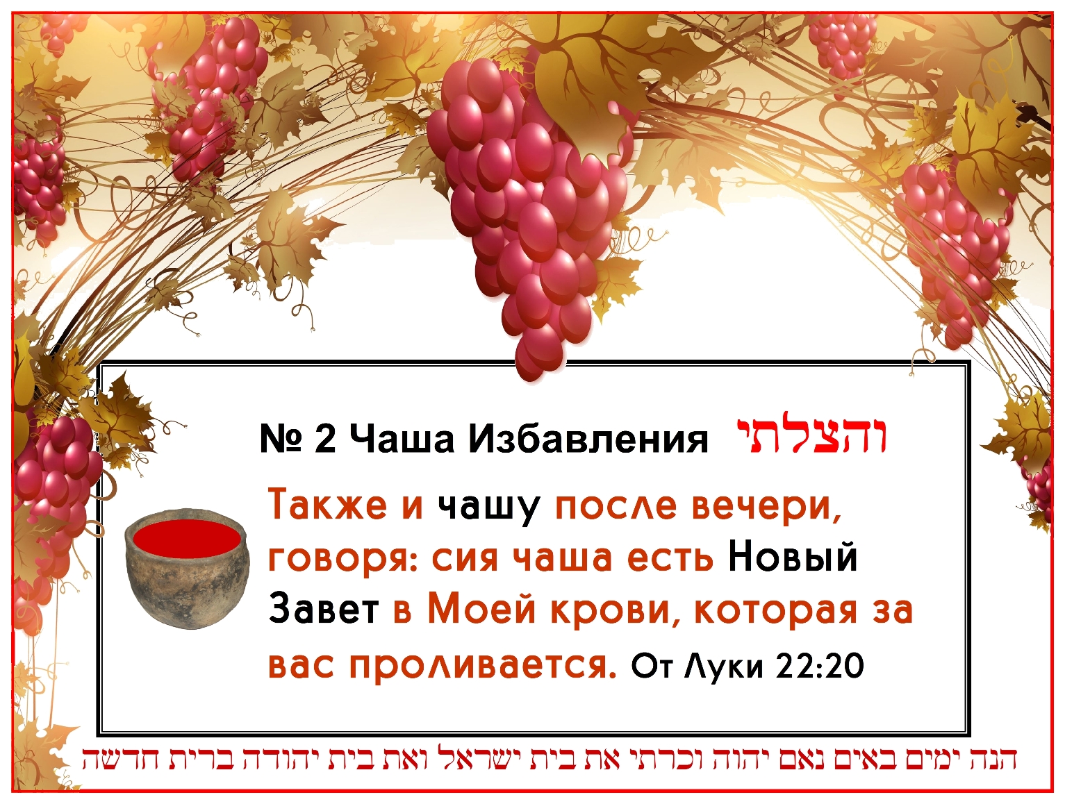 По причинам, изъясненным Творцом, мы также видим на Пасхе нашего Господа, четыре чаши вина, которые были упомянуты в этом порядке. Стих 17 – Во-первых, чаша перед ужином, который был назван “Я выведу вас“. Это истинная свобода от великого рабовладельца, сатаны, который имел контроль над человечеством со времен Адама и Евы, которые последовали за ним в Эдемском саду.