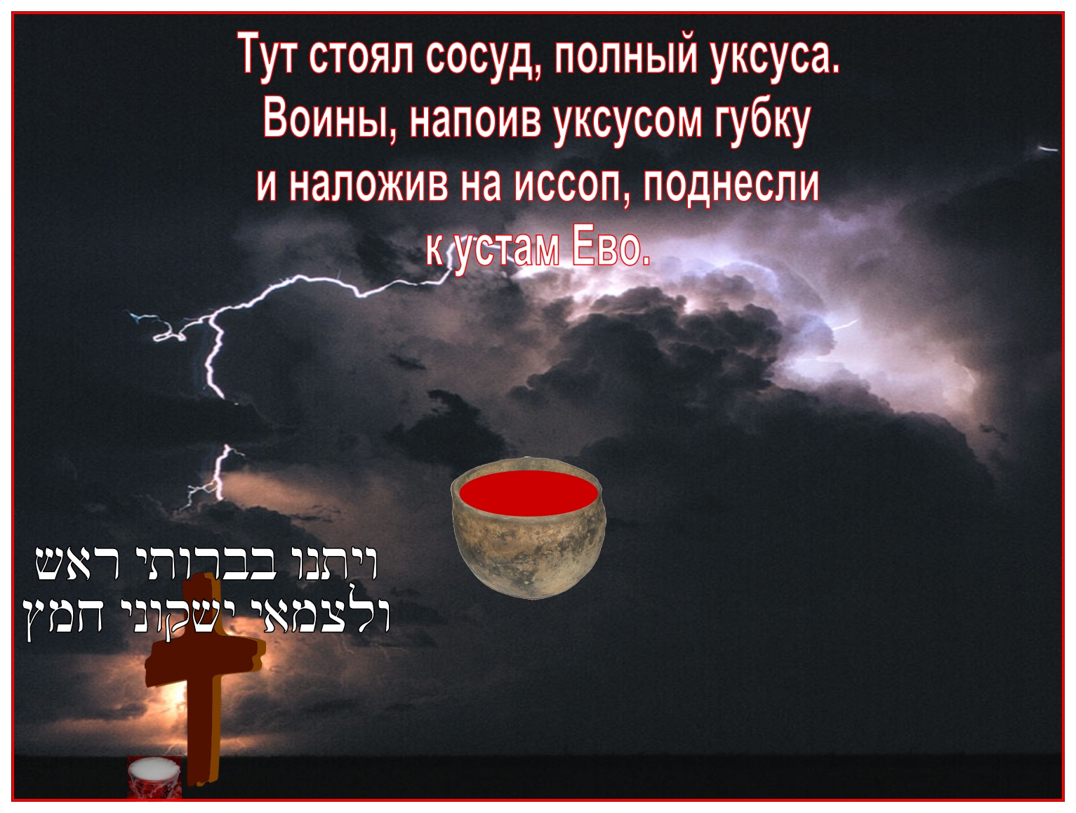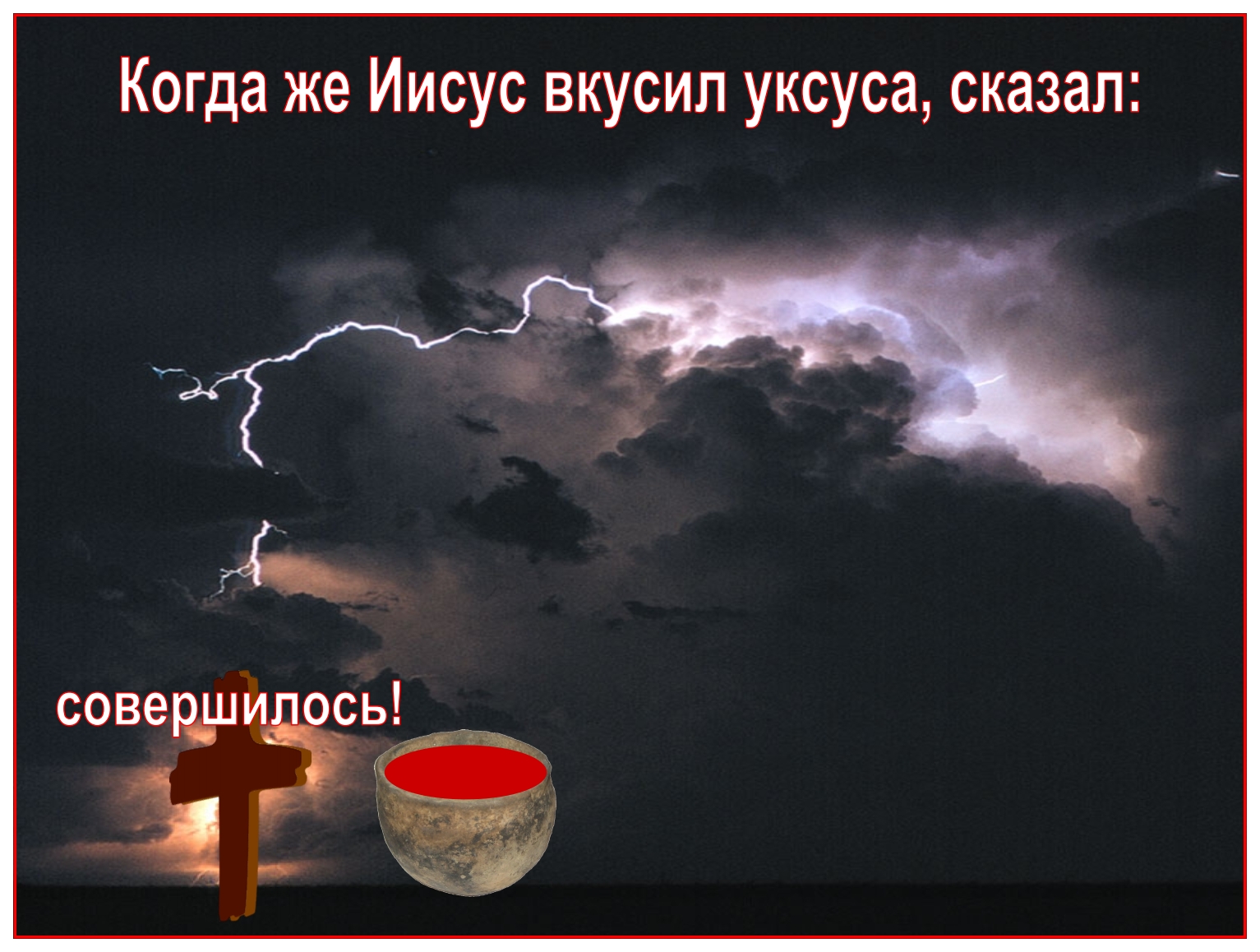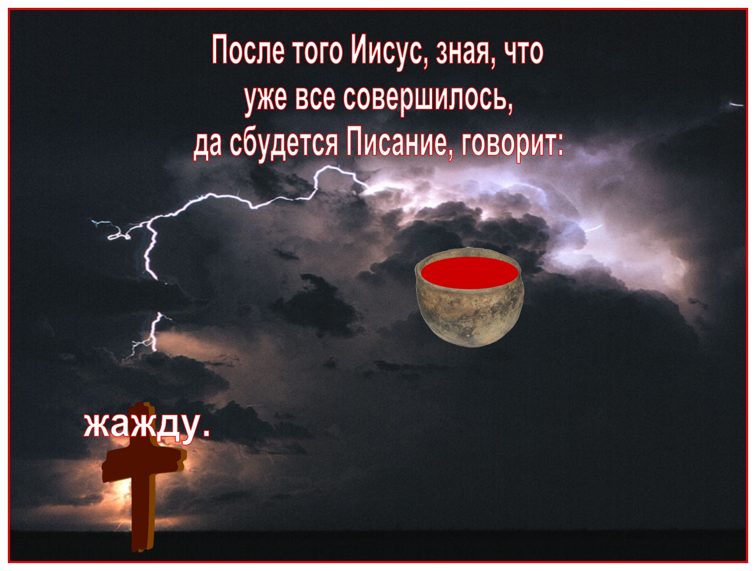 После того Иисус, зная, что уже все совершилось, да сбудется Писание, говорит: жажду. Тут стоял сосуд, полный уксуса. Воины, напоив уксусом губку и наложив на иссоп, поднесли к устам Его. Когда же Иисус вкусил уксуса, сказал: совершилось! И, преклонив главу, предал дух. Иоанна 19: 28-30