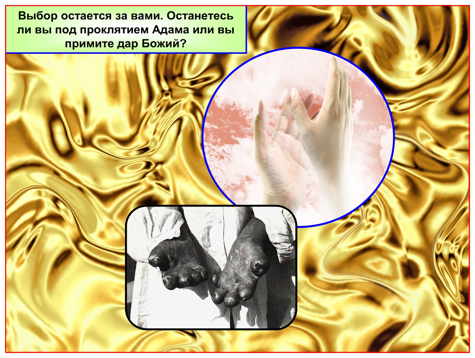 Бог дал Адаму выбор в Эдемском саду. Он сделал неправильный выбор и поверг мир в смерть и печаль, в которых мир по-прежнему существует. Мы можем предпочесть остаться под проклятием, просто ничего не делать, так как мы уже осуждены. Или вы можете сделать выбор, принять Мессию, о котором было сказано, в то время, когда Адам и Ева были осуждены. Этот Мессия уже пришел, и вы должны сделать выбор. Этот выбор произведет вечное изменение в вас, это называется новым рождением или рождением свыше.