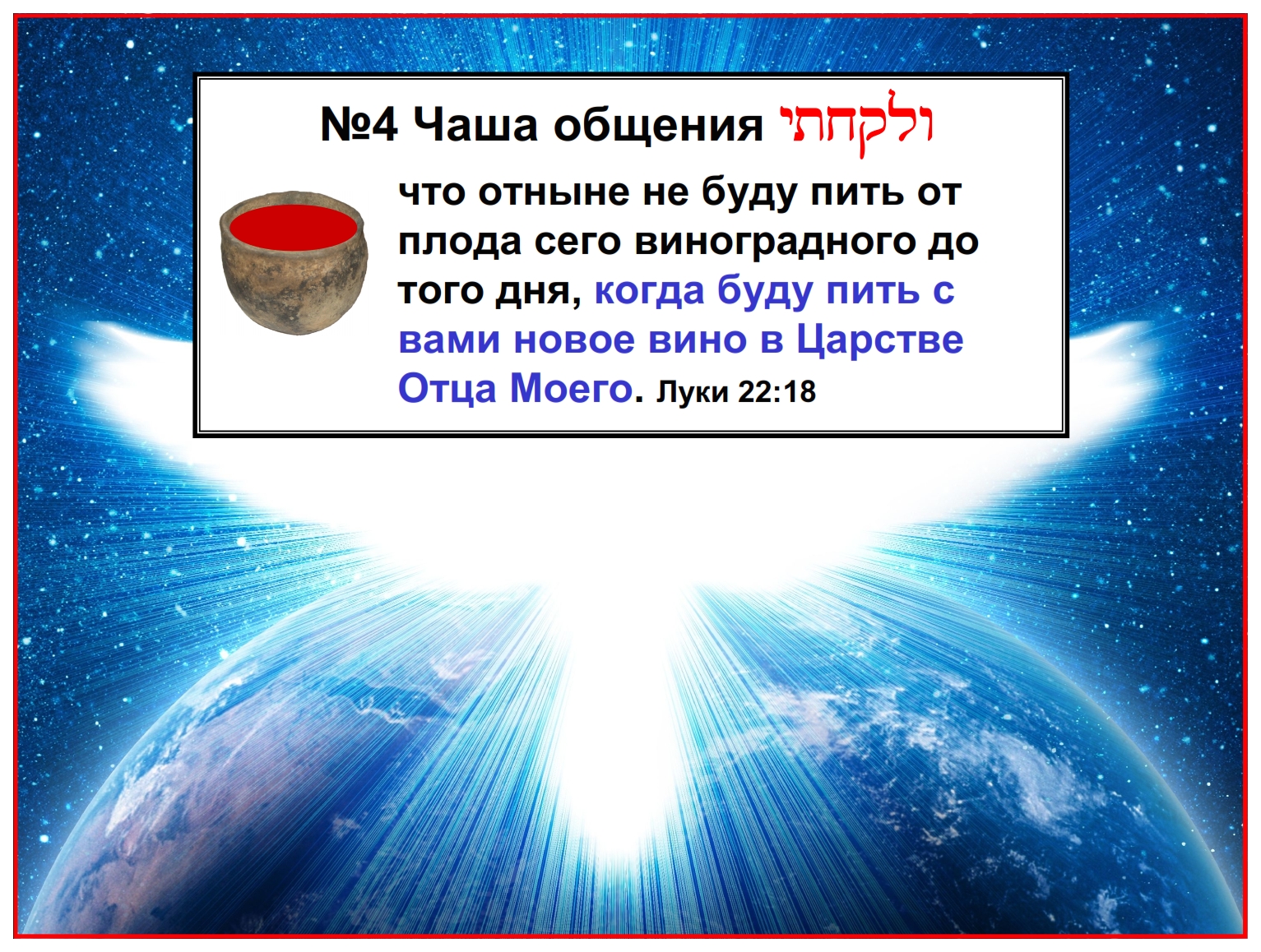 Стих 18 – четвертая чаша упомянута, но она отложена для использования в будущем. Иисус говорит Своим ученикам, что Он не будет пить с этой чаши, пока мы не будем с Ним в Царстве. Это чаша называется чашей общения или я приму вас Себе в народ. Его народ будет взят к Царю Царей и навсегда будет свободным.