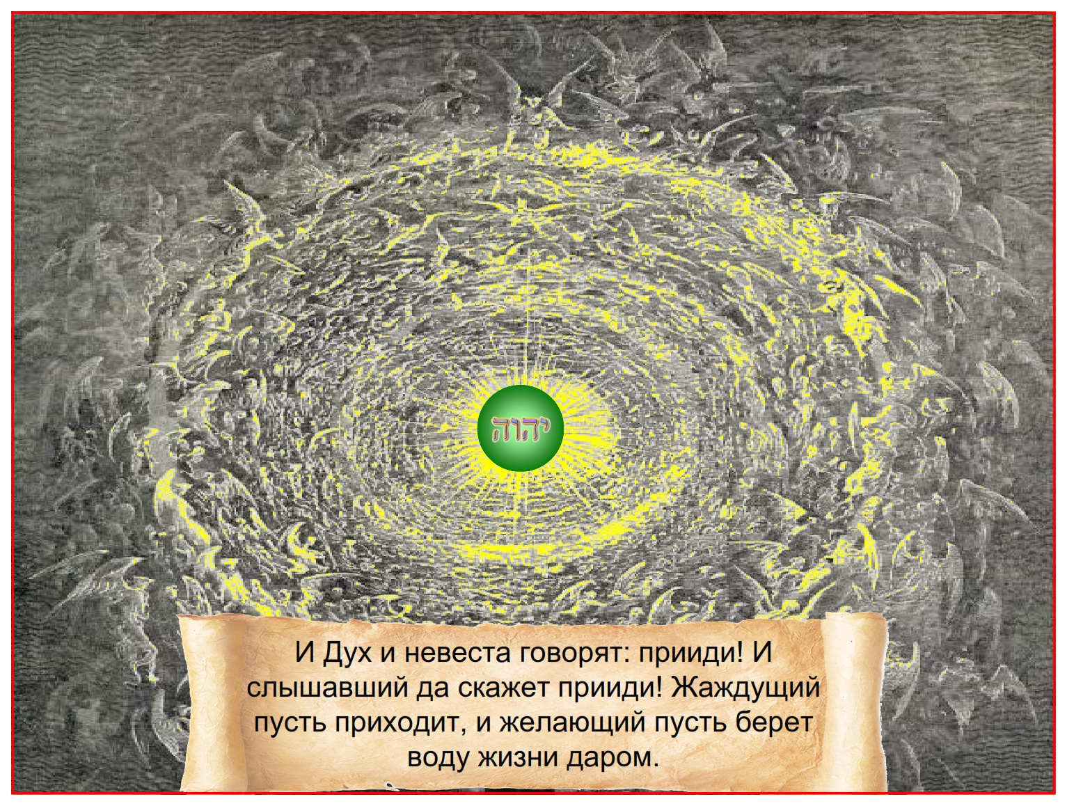 Откровение 22:16, 17 Я, Иисус, послал Ангела Моего засвидетельствовать вам сие в церквах. Я есмь корень и потомок Давида, звезда светлая и утренняя. И Дух и невеста говорят: прииди! И слышавший да скажет прииди! Жаждущий пусть приходит, и желающий пусть берет воду жизни даром.