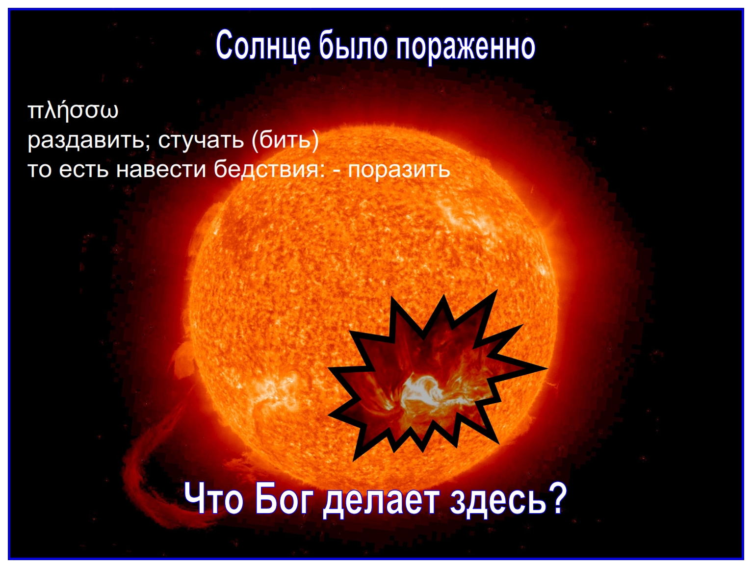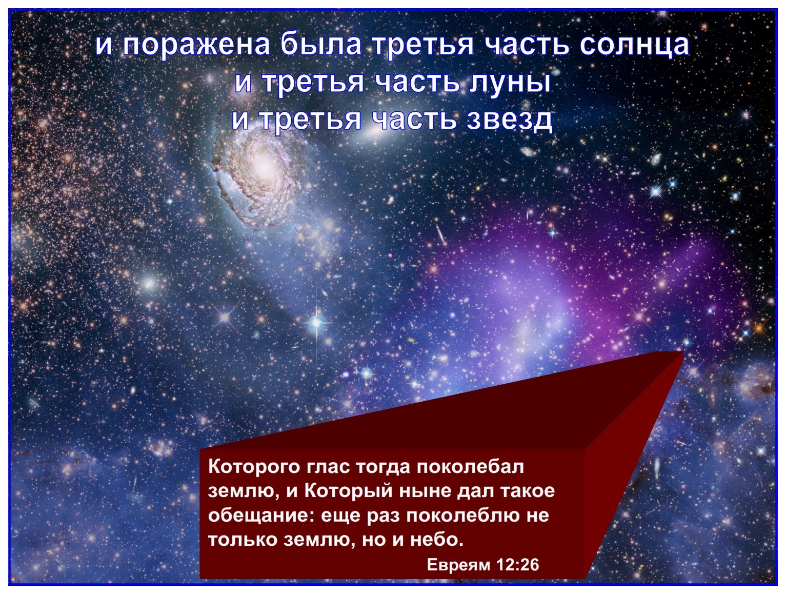 Четвертый Ангел вострубил, и поражена была третья часть солнца и третья часть луны и третья часть звезд, так что затмилась третья часть их, и третья часть дня не светла была–так, как и ночи. Откровение 8:12