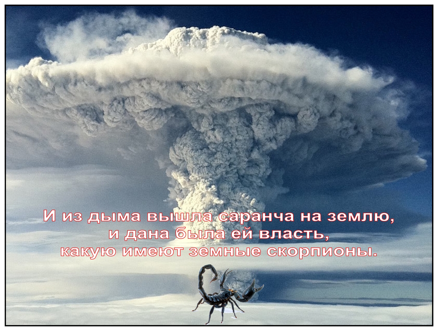 И из дыма вышла саранча на землю, и дана была ей власть, какую имеют земные скорпионы. И сказано было ей, чтобы не делала вреда траве земной, и никакой зелени, и никакому дереву, а только одним людям, которые не имеют печати Божией на челах своих. И дано ей не убивать их, а только мучить пять месяцев; и мучение от нее подобно мучению от скорпиона, когда ужалит человека. В те дни люди будут искать смерти, но не найдут ее; пожелают умереть, но смерть убежит от них. Откровение 9:3-6