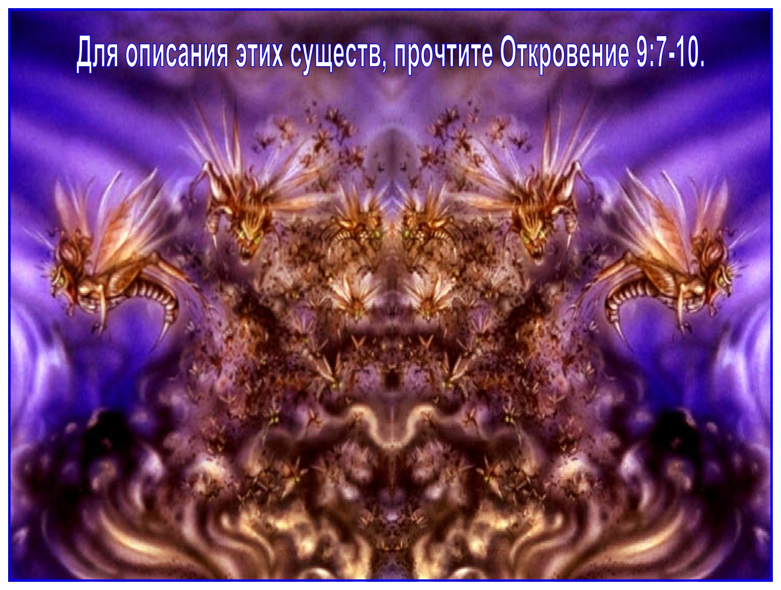 По виду своему саранча была подобна коням, приготовленным на войну; и на головах у ней как бы венцы, похожие на золотые, лица же ее–как лица человеческие; и волосы у ней–как волосы у женщин, а зубы у ней были, как у львов. На ней были брони, как бы брони железные, а шум от крыльев ее–как стук от колесниц, когда множество коней бежит на войну; у ней были хвосты, как у скорпионов, и в хвостах ее были жала; власть же ее была–вредить людям пять месяцев. Откровение 9:7-10