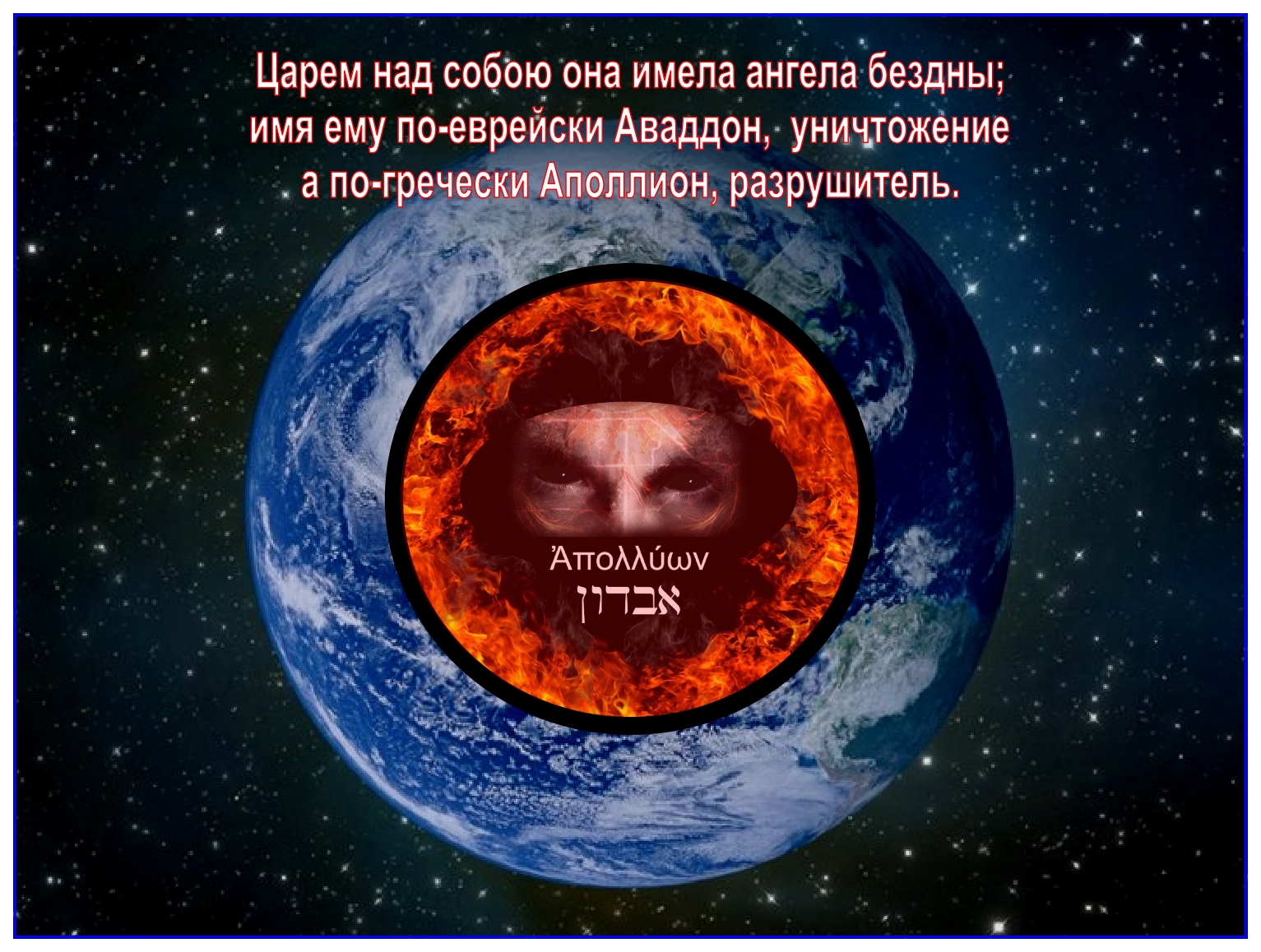 Царем над собою она имела ангела бездны; имя ему по-еврейски Аваддон, а по-гречески Аполлион. Откровение 9:11