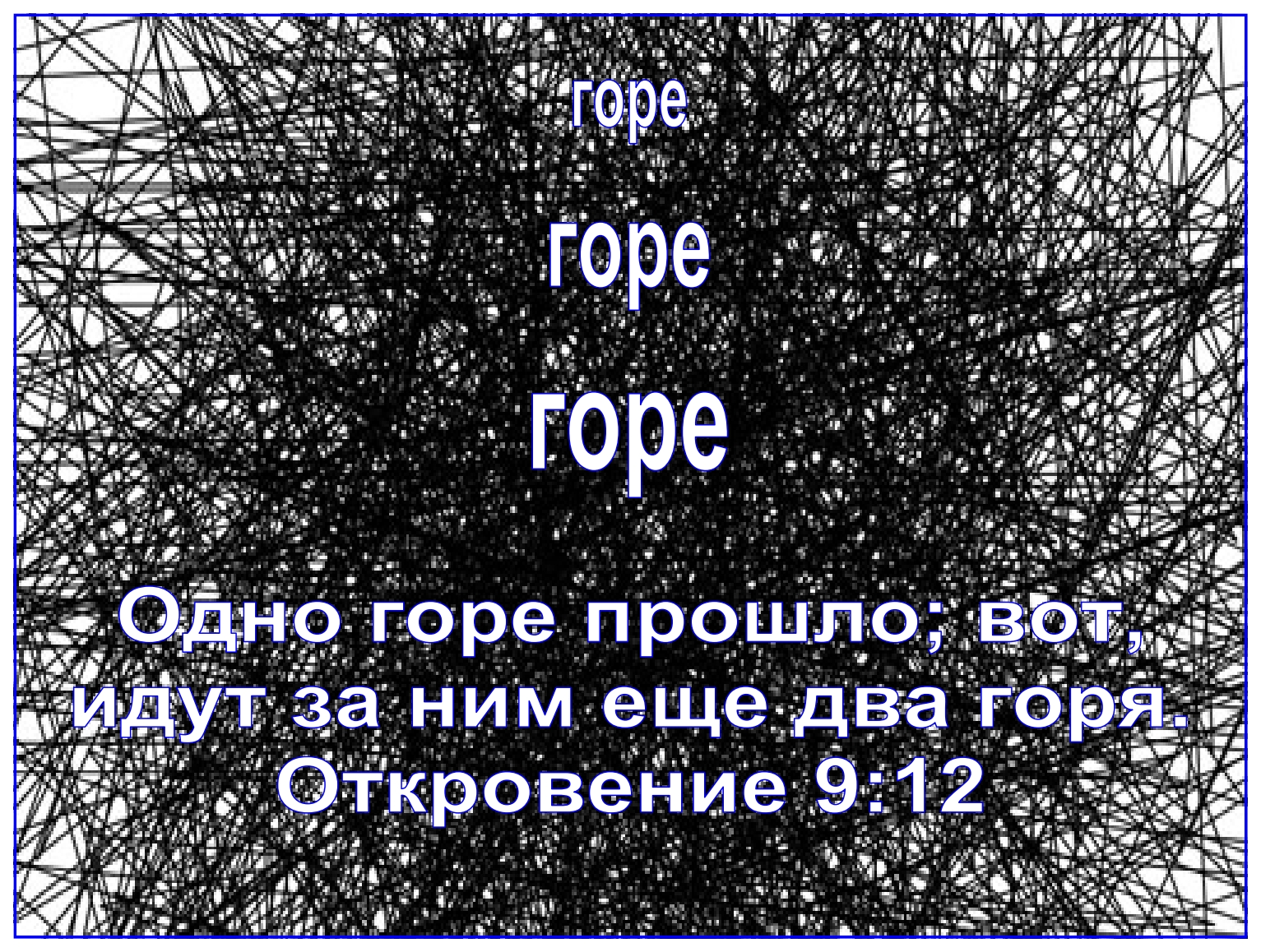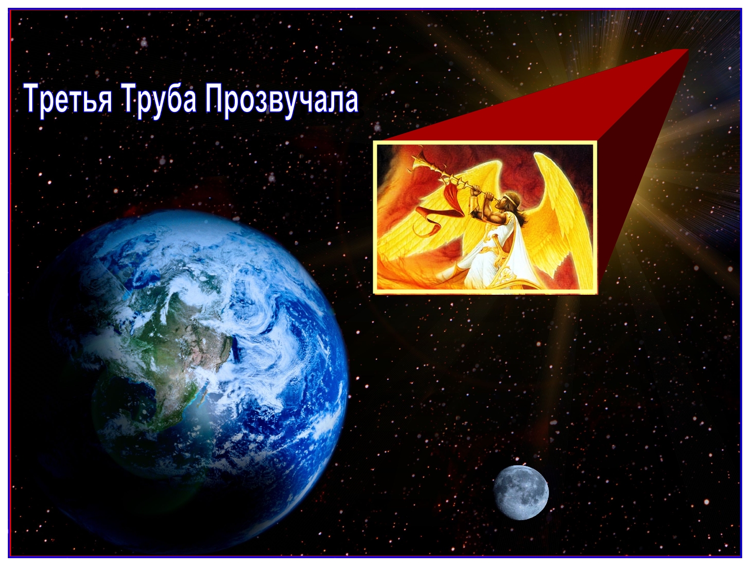 Откровение 8:13 И видел я и слышал одного Ангела, летящего посреди неба и говорящего громким голосом: горе, горе, горе живущим на земле от остальных трубных голосов трех Ангелов, которые будут трубить!