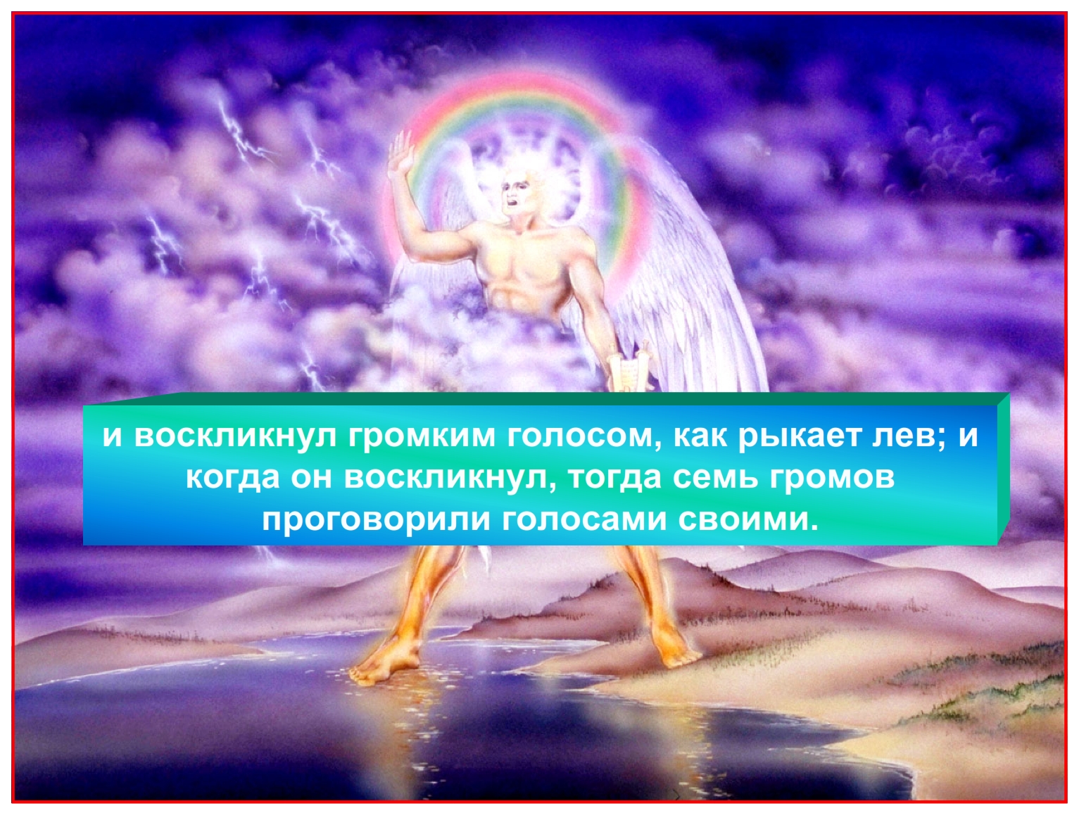 И видел я другого Ангела сильного, сходящего с неба, облеченного облаком; над головою его была радуга, и лице его как солнце, и ноги его как столпы огненные, в руке у него была книжка раскрытая. И поставил он правую ногу свою на море, а левую на землю, и воскликнул громким голосом, как рыкает лев; и когда он воскликнул, тогда семь громов проговорили голосами своими. Откровения 10:1-3