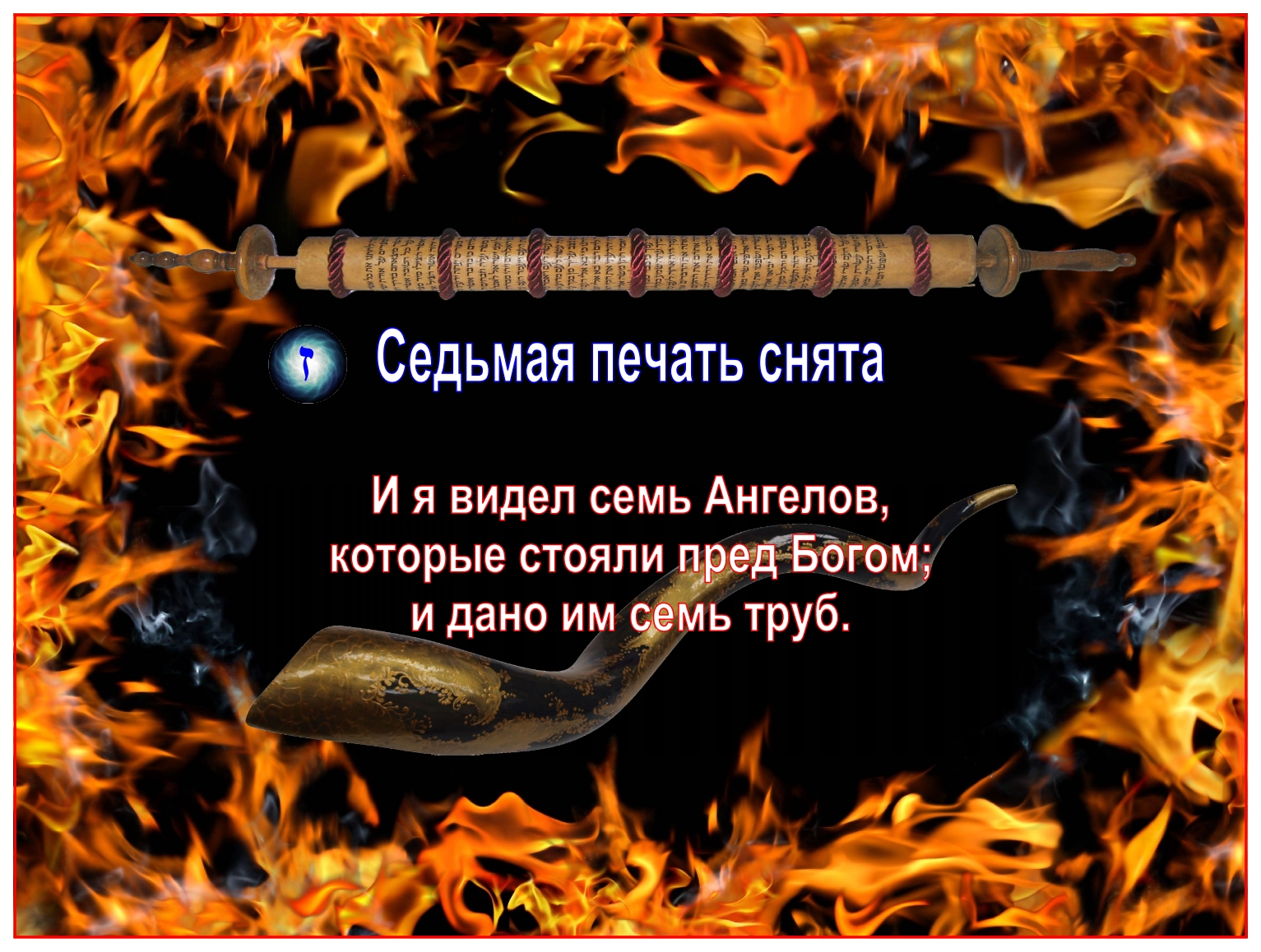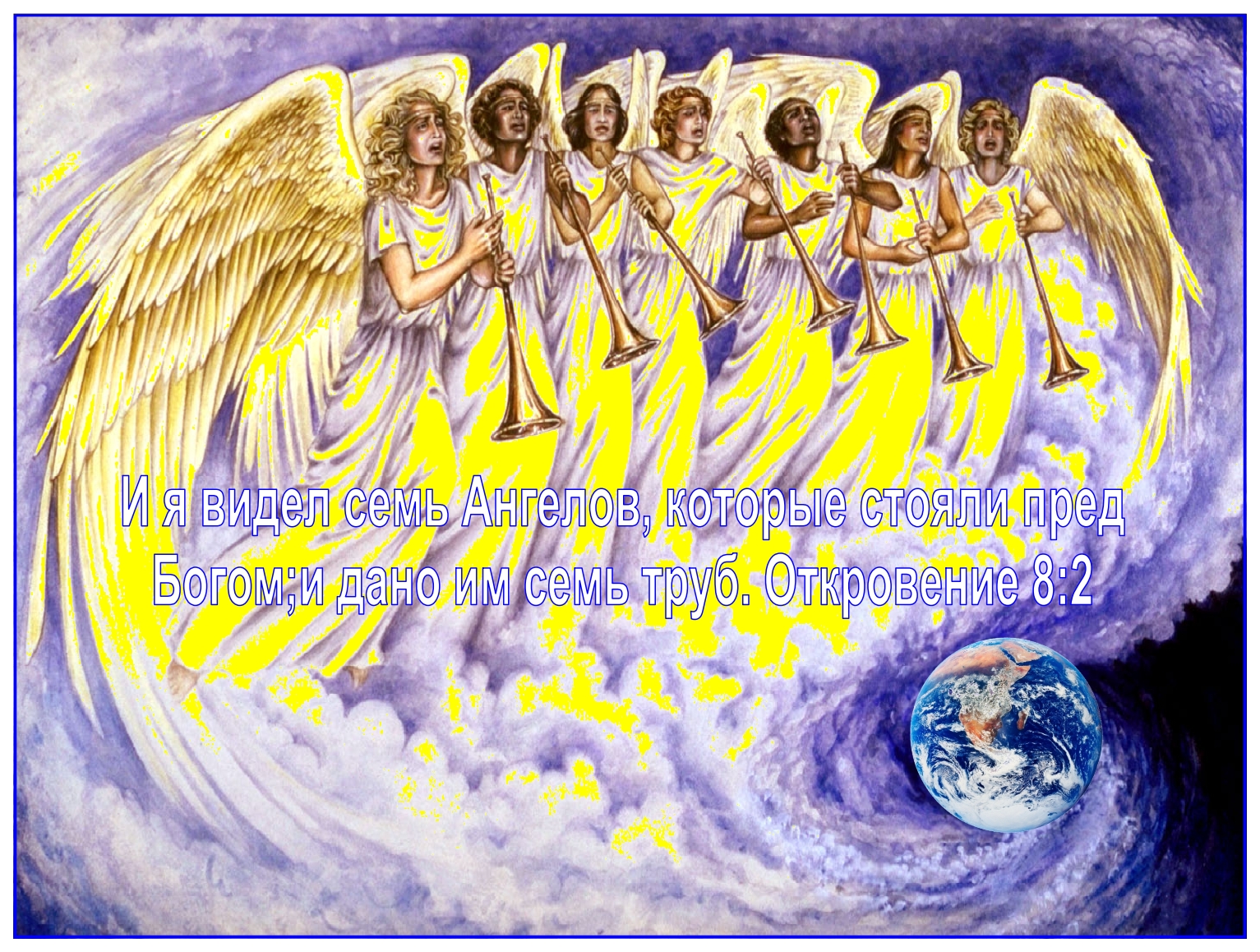 Откровение 8:1-6 И когда Он снял седьмую печать, сделалось безмолвие на небе, как бы на полчаса. И я видел семь Ангелов, которые стояли пред Богом; и дано им семь труб. И пришел иной Ангел, и стал перед жертвенником, держа золотую кадильницу; и дано было ему множество фимиама, чтобы он с молитвами всех святых возложил его на золотой жертвенник, который перед престолом. И вознесся дым фимиама с молитвами святых от руки Ангела пред Бога. И взял Ангел кадильницу, и наполнил ее огнем с жертвенника, и поверг на землю: и произошли голоса и громы, и молнии и землетрясение. И семь Ангелов, имеющие семь труб, приготовились трубить.