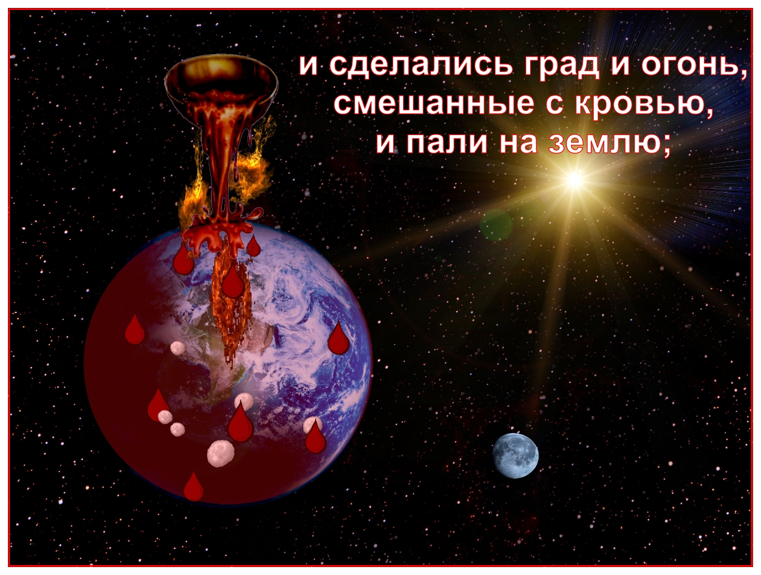 Трубные Суды начинают приносить на землю то, что противоречит естественному складу того, как мы видим природу. Понимайте это буквально, если об этом нет другого объяснения в Писании. Это естественно думать об огне, который грядет на Землю в виде пылающего метеорита, или града падающего на Землю, но это довольно необычно, чтобы кровь падала с неба.