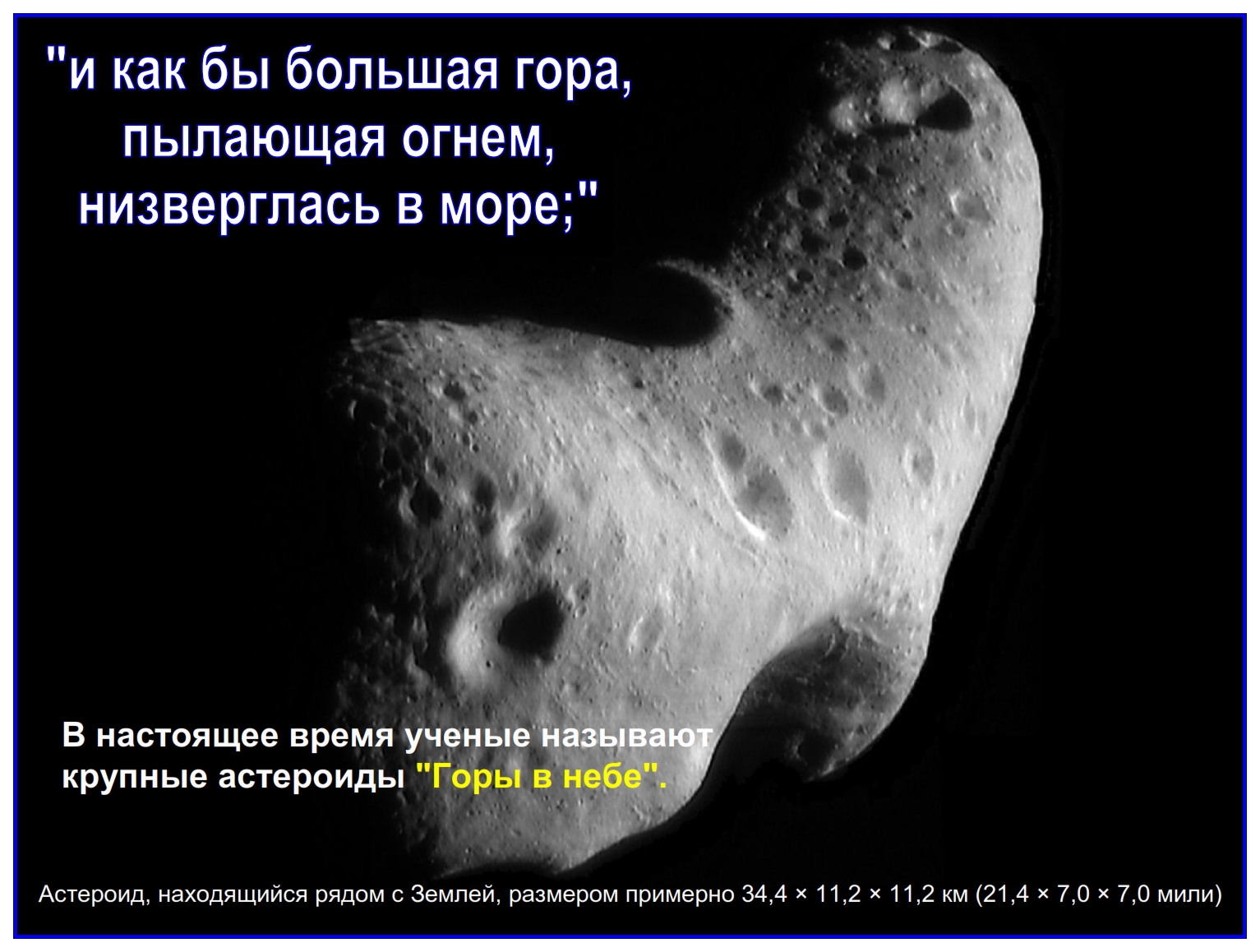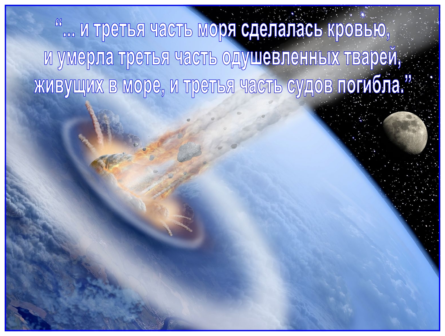 Откровение 8:8-9 Второй Ангел вострубил, и как бы большая гора, пылающая огнем, низверглась в море; и третья часть моря сделалась кровью, и умерла третья часть одушевленных тварей, живущих в море, и третья часть судов погибла.