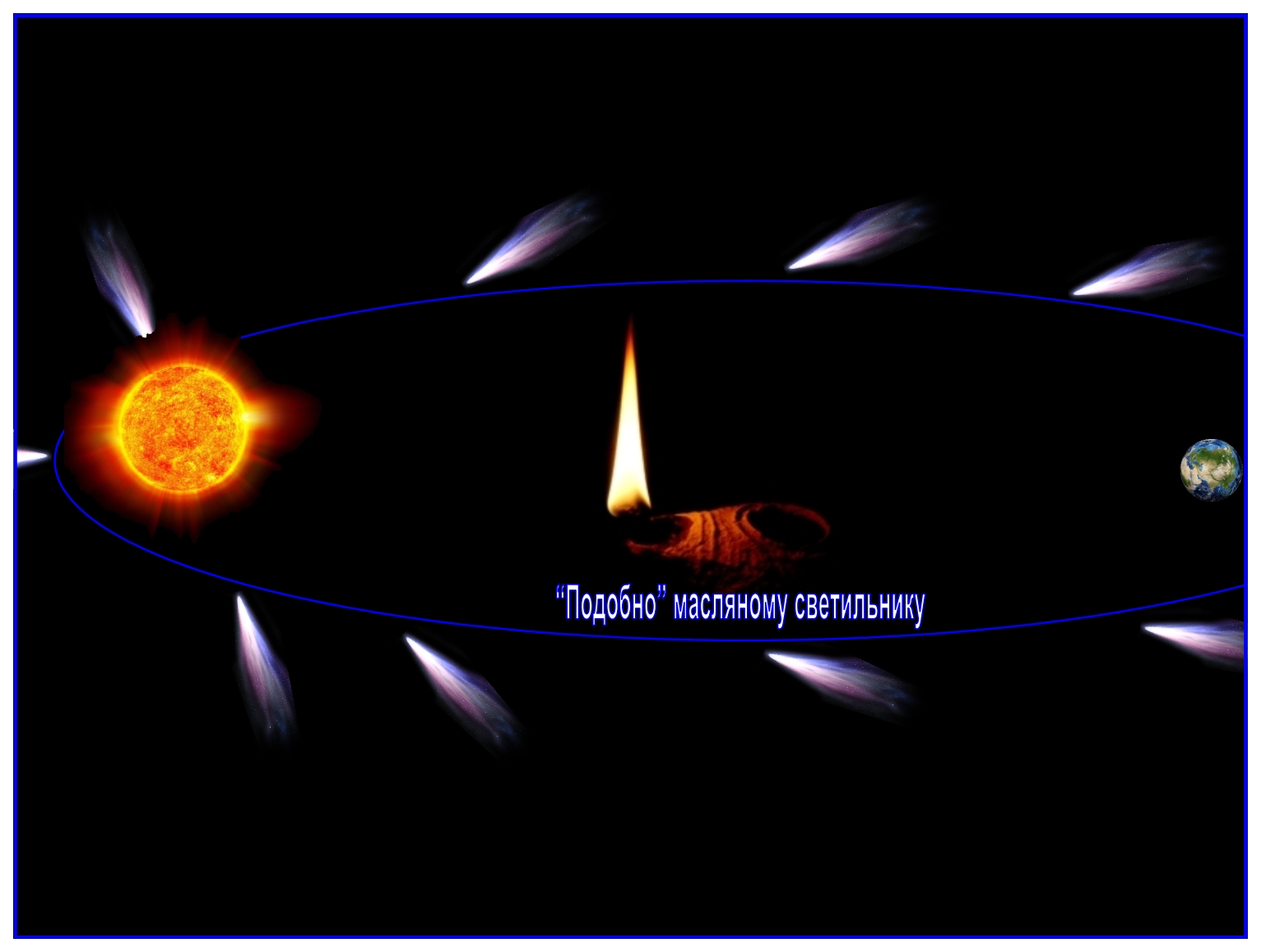 Хвост кометы всегда направлен от солнца, солнечные ветры выдувают ионизированные газы из кометы. Подобно древнему светильнику с оливковым маслом, независимо от того, куда светильник повернут, маленькое пламя всегда указывает в том же направлении.