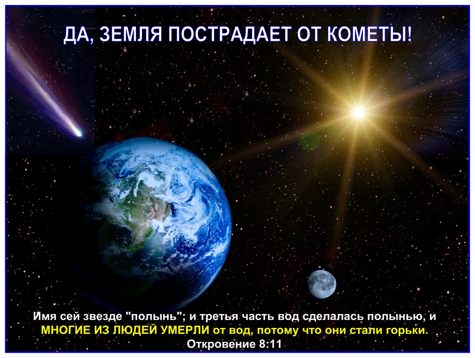 Когда комета входит в атмосферу Земли она взрывается и отравляющие газы от кометы будет рассеиваются над озерами и ручьями Земли.